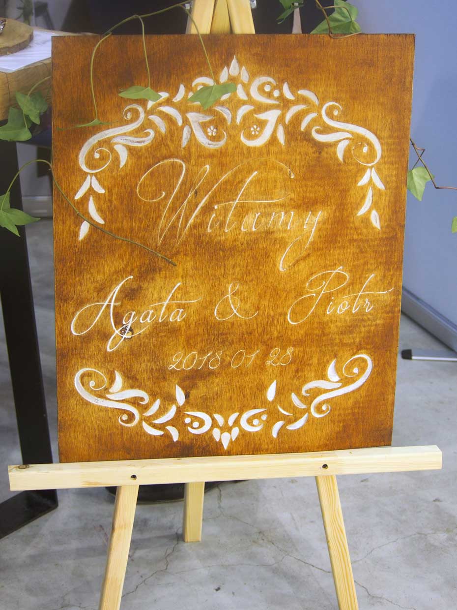 Mogą to być drewniane tabliczki zawieszone bezpośrednio nad głównym wejściem namiotu, stodoły, budynku. Mogą z powodzeniem stanowić tło - w formie drewnianej tablicy - za plecami Państwa Młodych za weselnym stołem. Oryginalnym pomysłem są m.in. tabliczki z napisem, przytwierdzone do krzeseł Państwa Młodych.