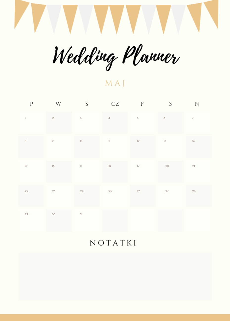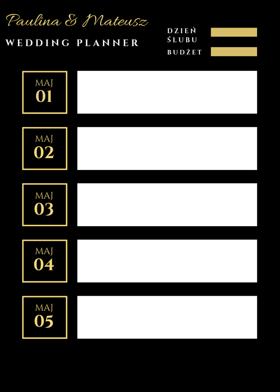 Jeśli zdecydujecie się na wydrukowanie każdego dnia z osobna w tym projekcie i stworzycie z niego formę notesu, to będzie to najbardziej funkcjonalny planner ślubny. Oczywiście moglibyśmy sięgnąć po zwykły kalendarz w postaci notesu, ale dlaczego nie zaprojektować go samemu na ten wyjątkowy czas organizacji ślubu? :)