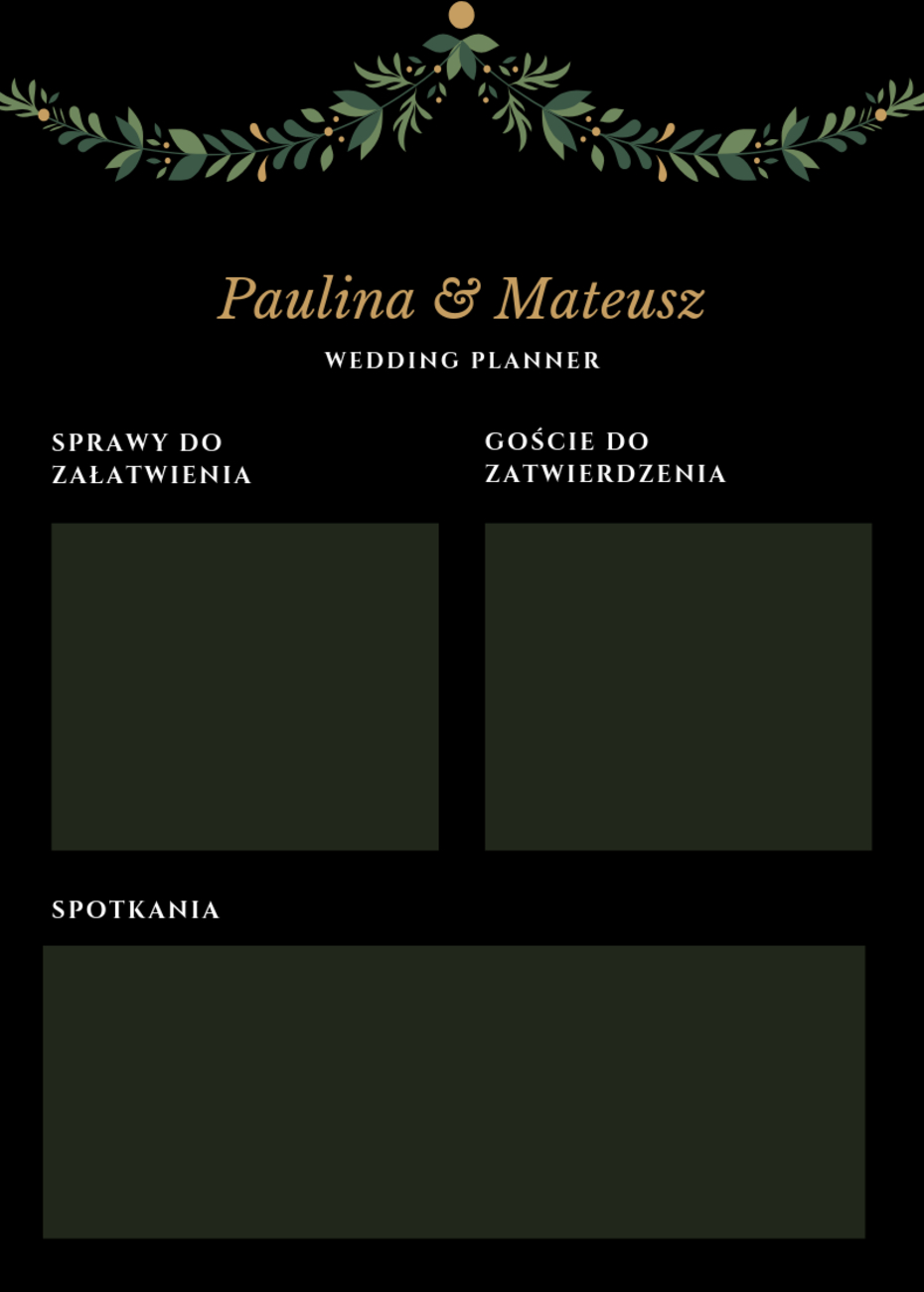 To dość uproszczony format, ale sprawdza się w podstawowych zapiskach podczas organizacji ślubu. Możecie oczywiście wpisać wybrane nagłówki oraz poświęcić jedną kartę dla każdego z nich, aby wystarczyło do końca miesiąca :)