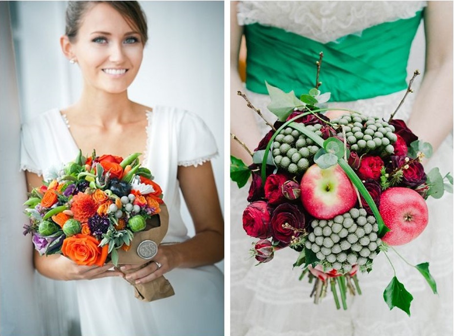 Dla panien odważniejszych zaproponuję bukiet tylko i wyłącznie z warzyw. Ekstrawagancko będzie wyglądał z roślin kapustnych – kalafior, brokuł, kapusta czerwona lub zielona. A może kompozycja ślubna z krwiście czerwonej czuszki czy innych odmian papryki? Może z dodatkiem zielonego groszku w otoczeniu tak modnej aktualnie gipsówki?