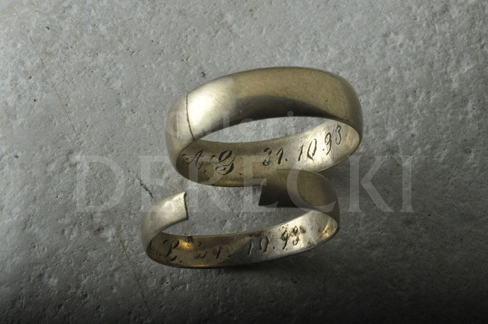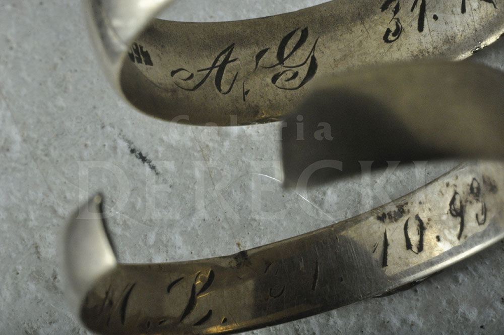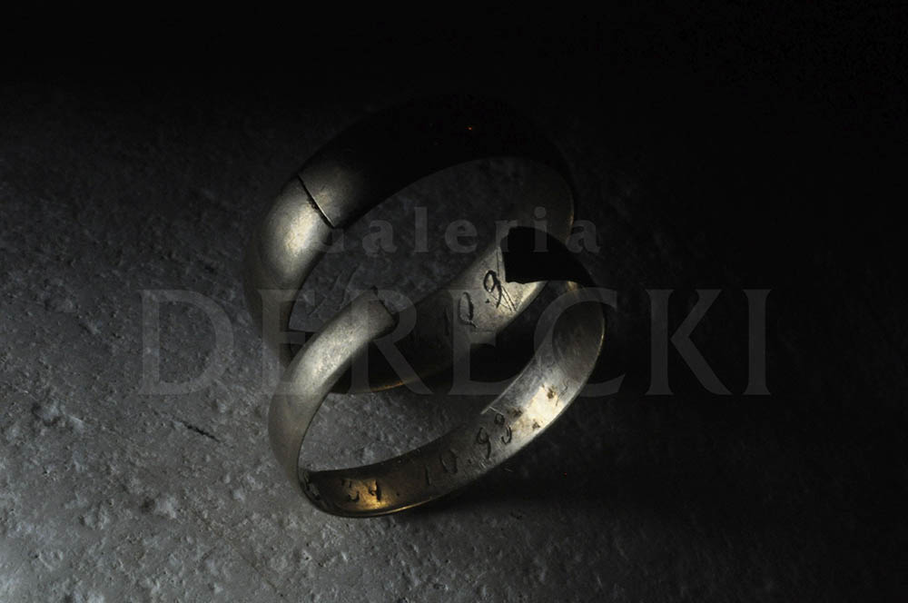 Niekiedy możemy tylko domyślać się jakich wydarzeń świadkami były zabytkowe precjoza. Tak też było z parą anonimowych obrączek które trafiły do naszego wystawcy Sławomira Dereckiego jakiś czas temu. Prawdopodobnie 'poszłyby na przetop' gdyby nie dwie rzeczy... Wygrawerowana data i ich stan który opowiada historię uczucia które przetrwało największą próbę. Męska obrączka zachowała się w dobrej kondycji, nosi ślady długiego użytkowania ale nie jest przetarta i uszkodzona. Damska, jest znacznie mocniej spracowana, widoczne jest że była noszona dużo dłużej... świadczy to o uczuciu które płonęło nawet po śmierci bliskiej osoby. Na obu widnieje data 31.10.1893 r. Znaczy to że para zawarła związek małżeński dzień przed świętem Wszystkich Świętych, dokładnie 125 lat temu.