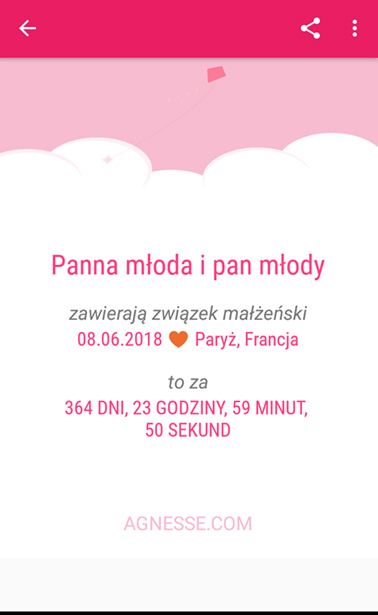 Aplikacja niejako połączona z Wedding Checklists, jednak w języku polskim i nieznacznie podobna do Agnesse, jednak zdecydowanie bardziej rozbudowana. Jak widzicie, podzielona jest na kategorie dotyczące zarówno terminów, których musicie dopilnować, ale także zakupów, które musicie zrobić. Każdy podpunkt został maksymalnie dopracowany łącznie z podziałem listy gości na stronę Pani Młodej i Pana Młodego. Zdecydowanie bardziej przejrzysta od Wedding Checklists i będzie idealną alternatywą dla tych z Was, którzy mają problem z językiem angielskim.