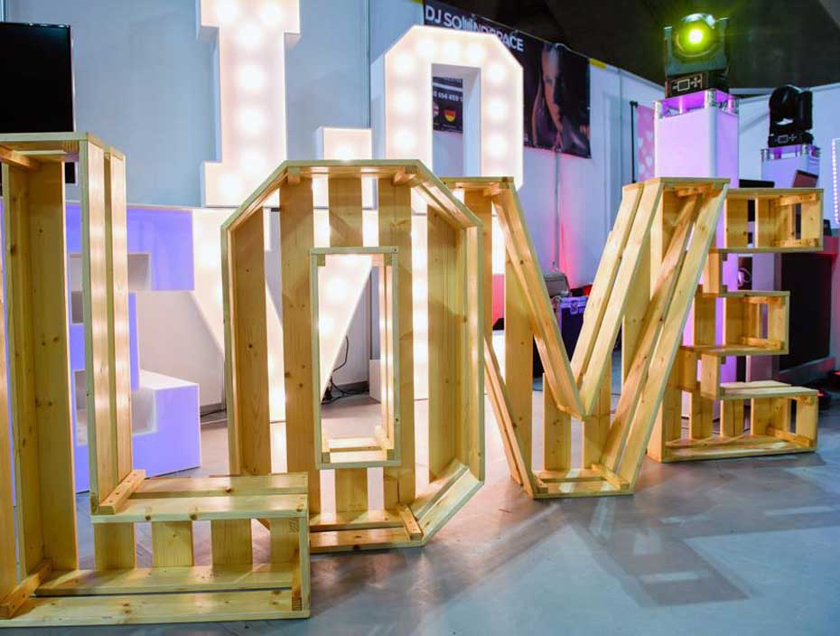 Podświetlane litery często pojawiają się w formie inicjałów Pary Młodej w formacie 3D. Pięknie komponują się z wystrojem sali weselnej. Sprawiają, że uroczystość nabiera spersonalizowanego charakteru. Bardzo pożądane są wielkoformatowe, neonowe napisy. Wykorzystywane są jako tło za stołem Państwa Młodych lub w plenerze do romantycznych zdjęć.