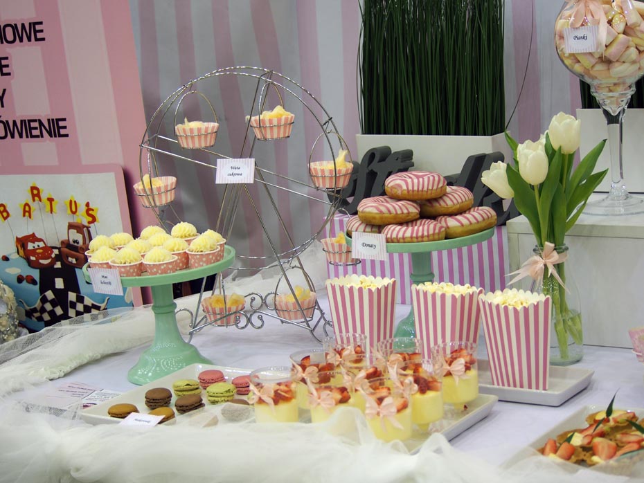 Niekwestionowanymi królami candy barów są na pewno makaroniki, które możemy mieć w dowolnym kolorze z rozmaitym nadzieniem. Te małe ciasteczka, delikatne i kruche, stanowią piękną ozdobę same w sobie. Ostatnim trendem, który przywędrował do nas zza granicy, są ścianki z donatów.