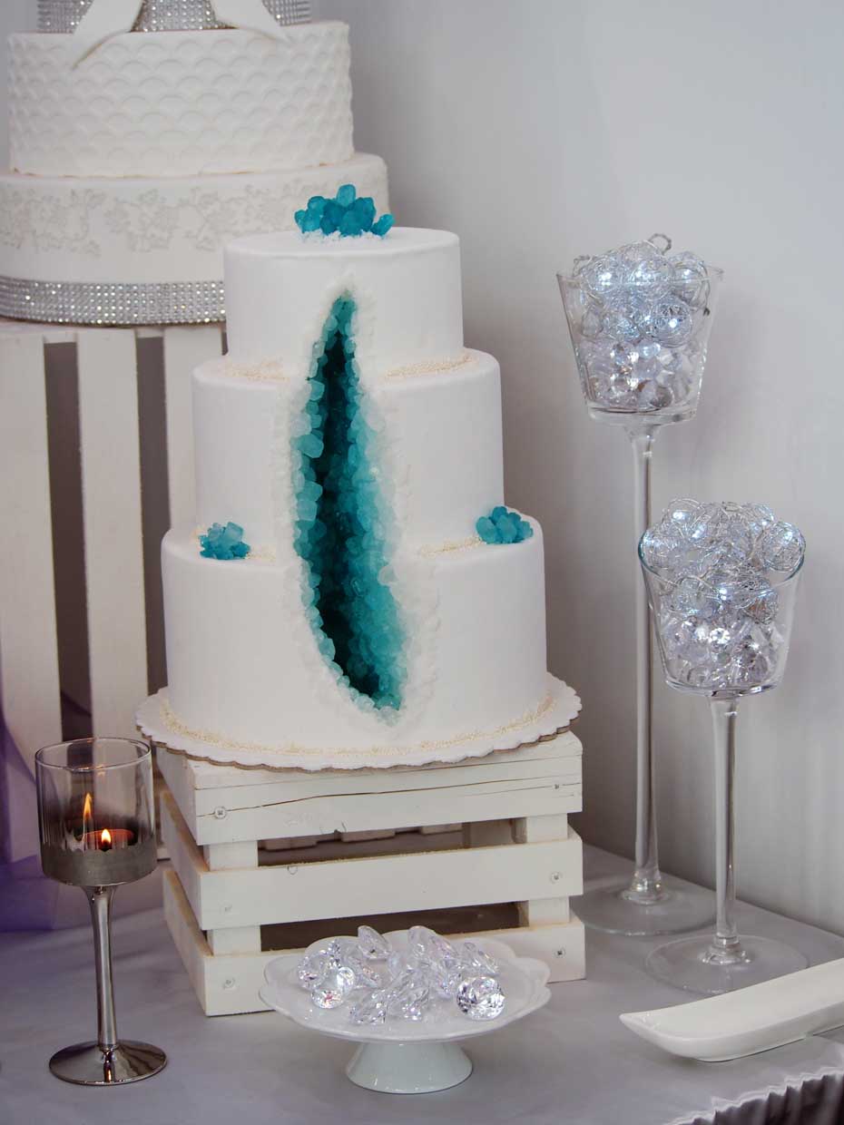 Dużą popularnością cieszą się też torty z babeczek, we wzory geometryczne, drip cake oraz torty geoda, które przypominają kryształy górskie.