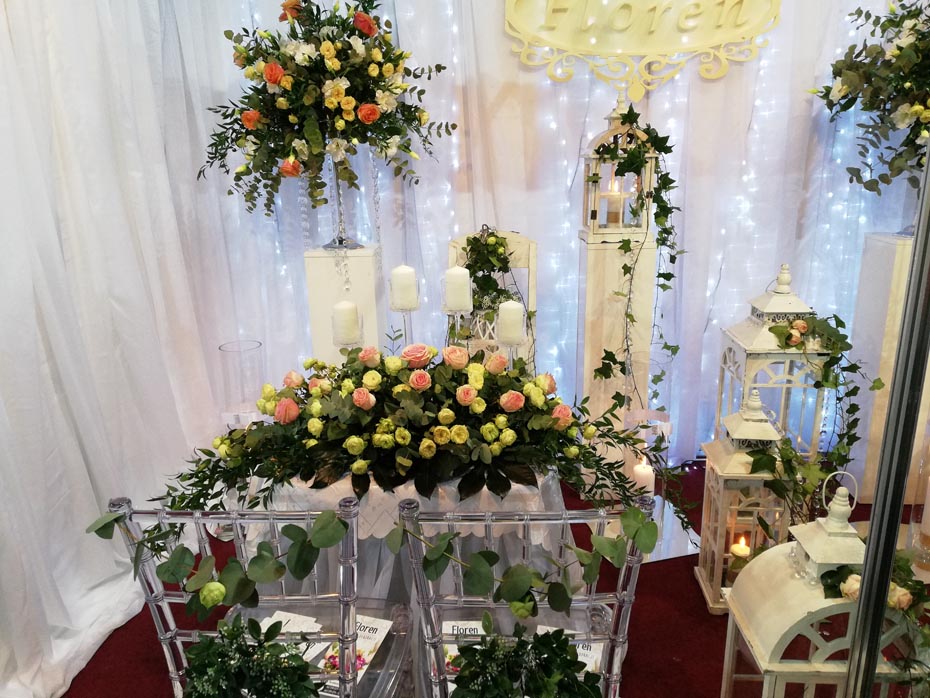 W kwestii dekoracji i kwiatów nie było dużego wyboru… Jedynie trzy firmy z tej branży postanowiły zaprezentować swoje produkty na targach. Na uwagę zasługuje maleńka lokalna pracownia Floren, która przygotowała piękną aranżację wystroju sali w klimacie greenery.