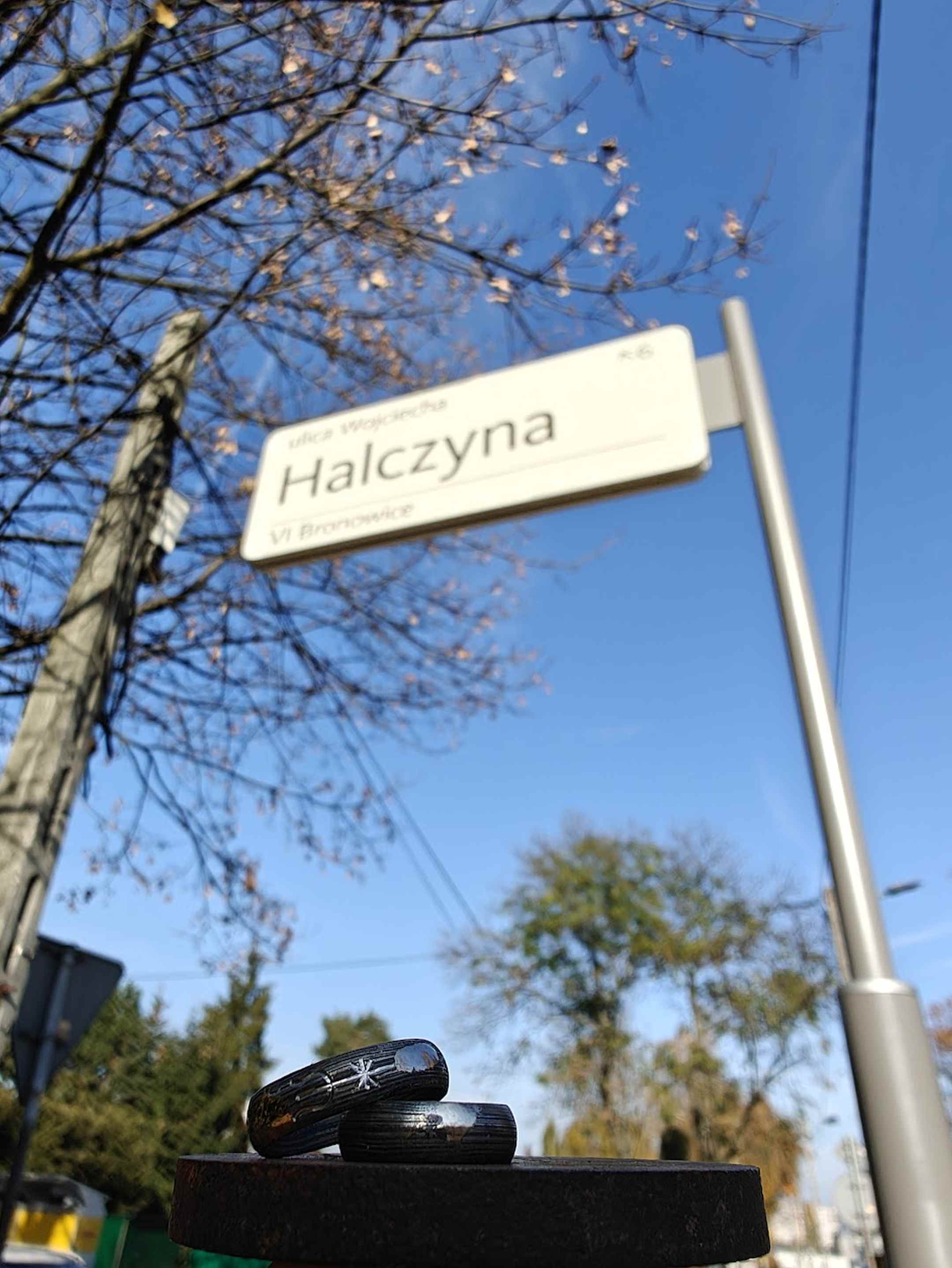 Obrączki z kolekcji „Halczyna” sfotografowane na tle ulicy Halczyna w Krakowie – symboliczne połączenie z nazwą kolekcji.