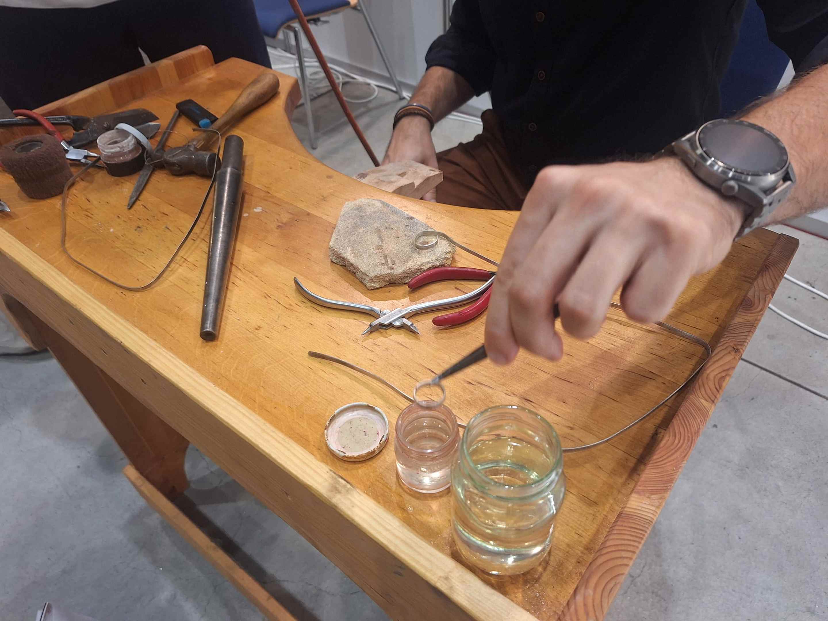Narzędzia złotnicze i ręcznie tworzona obrączka w trakcie prac.