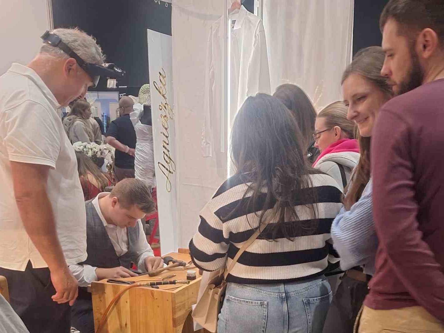 Jedną z atrakcji był pokaz tworzenia obrączek na żywo przez Sławomira Dereckiego, uznanego w Polsce złotnika i właściciela galerii. Wśród obserwatorów zebrały się pary młode i miłośnicy rękodzieła, którzy mieli okazję zobaczyć, jak artysta przekształca metale szlachetne w eleganckie obrączki, nad każdym detalem pracując z niezwykłą precyzją. Dla wielu było to wyjątkowe doświadczenie – nieczęsto można obserwować, jak rodzi się biżuteria w rękach mistrza złotnictwa, który każdy etap wykonania podporządkowuje niepowtarzalnemu charakterowi ostatecznej wizji obrączek. Każda para mogła wziąć udział w procesie – wykuwając obrączki, tworząc coś naprawdę osobistego.