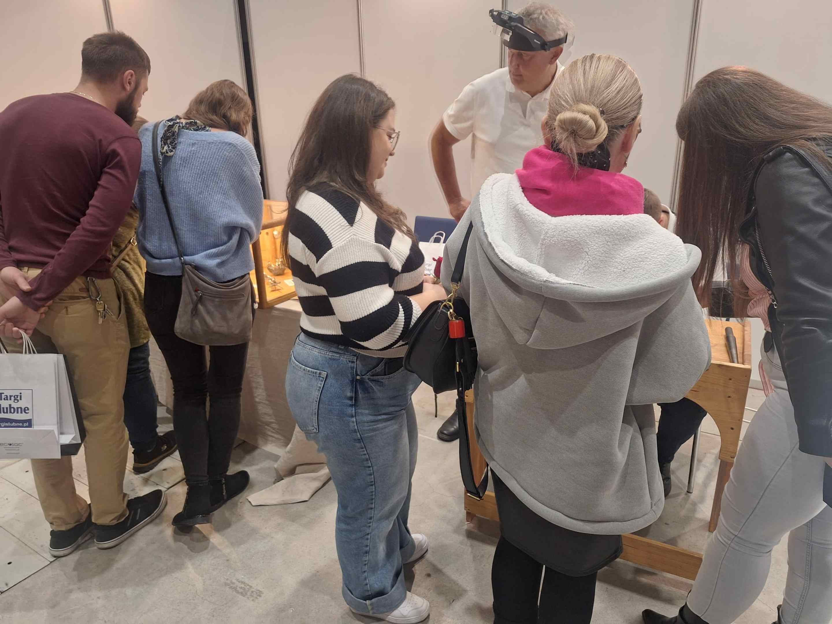 Sławomir Derecki, złotnik z Wrocławia, prezentuje proces rękodzielniczy, wzbudzając zainteresowanie odwiedzających.