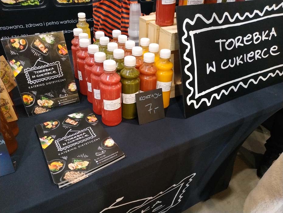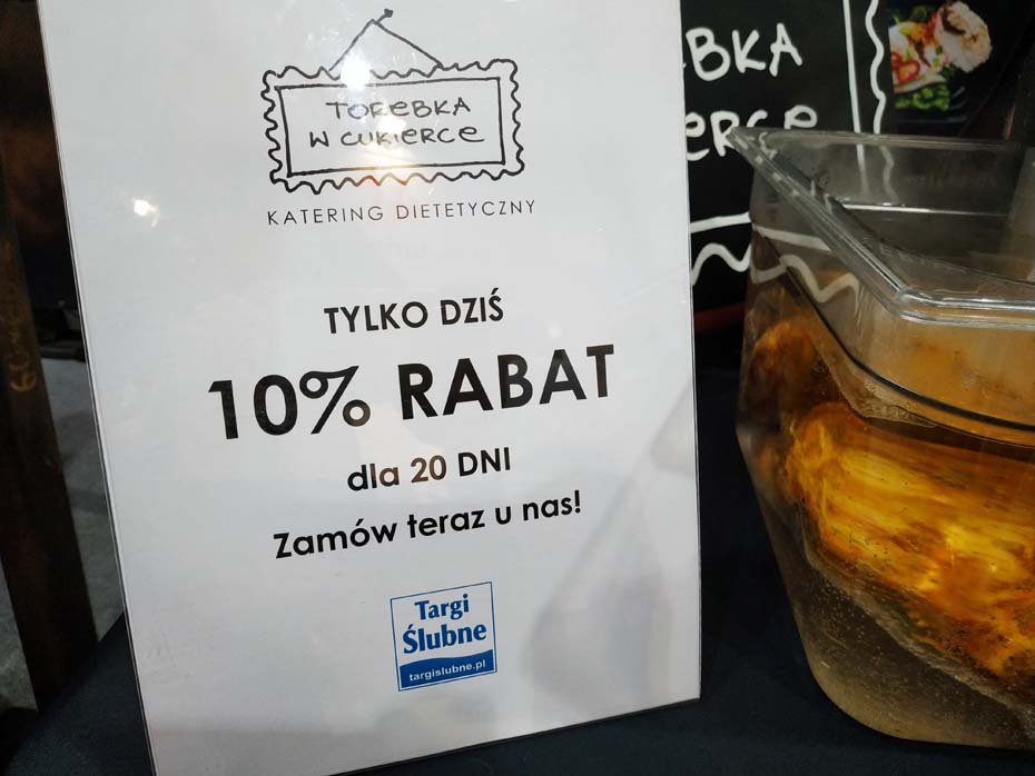 Na targach pojawił się również katering dietetyczny Torebka w cukierce. Właścicielka miała ze mnie trochę ubaw, kiedy zapytałam o to, w jakim właściwie celu wystawili się na takiej imprezie. Tłumacząc się, chciałam wiedzieć, czy poza kateringiem przedweselnym – no halo, która z przyszłych Panien Młodych nie myśli o tym, że trzeba troszkę zrzucić tu i tam – oferują również catering weselny. Ostatecznie okazało się, że to nie było wcale takie głupie pytanie, bo po spróbowaniu pyszności, oferowanych na stoisku, o tę kwestię pytało więcej osób. Padały również prośby o dostarczenie menu wegetariańskiego, którego w ofercie wybranej przez Młodych sali po prostu nie było – to też bardzo fajna opcja. Z tego miejsca puszczam oczko do Pani Magdy, która uraczyła mnie przepyszną zupą dyniową na mleczku kokosowym. Pani Magdo, tak jak wspominałam, czekamy na Was w Katowicach! :)