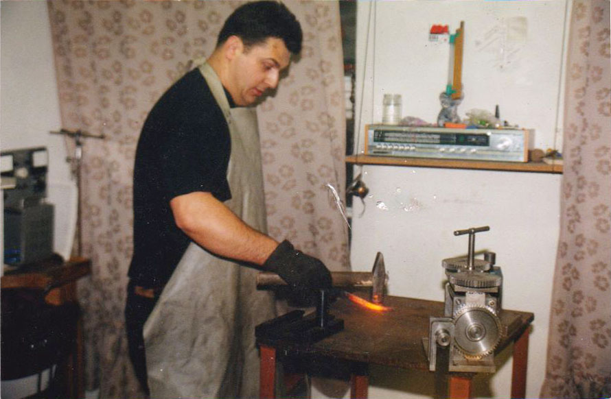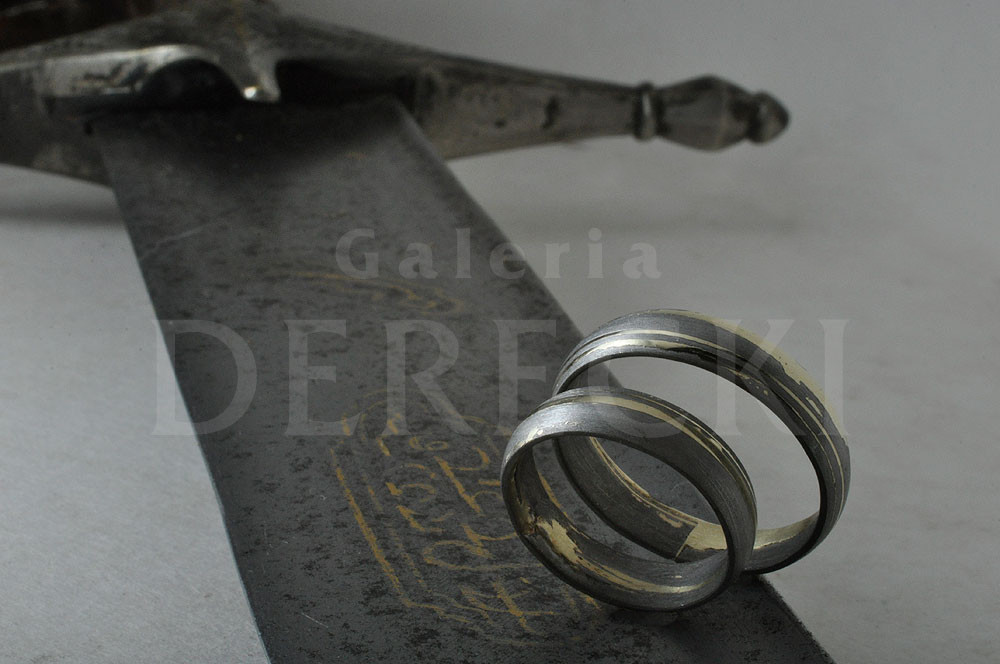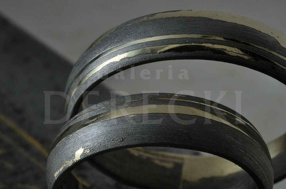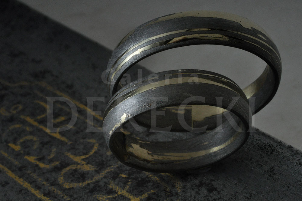 Wiekowe, wschodnie ostrze ze stali damasceńskiej pokryte złotym damaskinażem zainspirowało artystę do stworzenia kutych, meteorytowych pierścieni w wyjątkowy sposób łączących się ze złotem. Obrączki, które otrzymał, mają w strukturze Gibeonu zatopione złote, silnie kontrastujące płytki. Sprawiają one, że zarówno gwiezdna materia, jak i cenny, ziemski kruszec w pełni uwydatniają swoje walory estetyczne, stając się niezapomnianą pamiątką dla wyjątkowej Młodej Pary.
